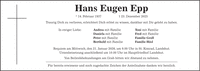 Hans Eugen Epp * 14. Februar 1937 + 23. Dezember 2025 Traurig Dich zu verlieren, erleichtert Dich erlöst zu wissen, dankbar mit Dir gelebt zu haben. In ewiger Liebe: Andrea mit Familie Toni mit Familie Daniela mit Familie Fred mit Familie Peter mit Familie Familie Groll Berthold mit Familie Familie Hösl Requiem am Mittwoch, den 21. Januar 2026, um 9.00 Uhr in St. Konrad, Landshut. Urnenbeisetzung anschließend um 10.00 Uhr im Hauptfriedhof Landshut. Von Beileidsbekundungen am Grab bitten wir Abstand zu nehmen. Für bereits erwiesene und noch zugedachte Zeichen der Anteilnahme danken wir herzlich.