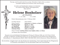 Traurig, weil Du nicht mehr bei uns bist. Erleichtert, Dich erlöst zu wissen. Unendlich dankbar für all Deine Liebe und Fürsorge. In Liebe und Dankbarkeit nehmen wir Abschied von unserer lieben Mama, Schwiegermama, Oma und Uri Helene Bonholzer geb. Schmalhofer * 1. 12. 1932 + 9. 2. 2026 Furth, Oberneuhausen, den 17. Februar 2026 In stiller Trauer: Deine Enkel: Deine Töchter: Sebastian mit Nicole und Kevin Rosi Wenninger Katrin mit Toni mit Reinhard Michael mit Lena Rita Schweiger Florian mit Sandy Christine Franz Julia mit Florian Deine Urenkel: Ludwig, Emily, Leni, Sophia, Lukas und Jonas im Namen aller Verwandten Requiem mit anschließender Beerdigung am Freitag, 20. Februar 2026, um 14.30 Uhr in Furth. Anstelle von Blumen und Kränzen bitten wir um eine Spende für den Förderverein Pflegestation Obersüßbach e.V., Spendenkonto IBAN: DE***, Kennwort: Helene Bonholzer. Ein herzliches 'Vergelt's Gott' für alle Zeichen der Anteilnahme. Unser tiefer Dank gilt der Pflegestation St. Elisabeth, Obersüßbach, für die jahrelange Pflege und Unterstützung.