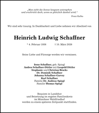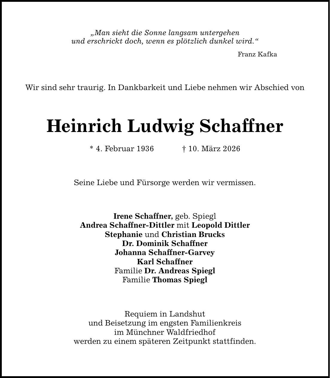 "Man sieht die Sonne langsam untergehen und erschrickt doch, wenn es plötzlich dunkel wird." Wir sind sehr traurig. In Dankbarkeit und Liebe nehmen wir Abschied von Heinrich Ludwig Schaffner * 4. Februar 1936 _ 10. März 2026 Seine Liebe und Fürsorge werden wir vermissen. Irene Schaffner, geb. Spiegl Andrea Schaffner-Dittler mit Leopold Dittler Stephanie und Christian Brucks Dr. Dominik Schaffner Johanna Schaffner-Garvey Karl Schaffner Familie Dr. Andreas Spiegl Familie Thomas Spiegl Requiem in Landshut und Beisetzung im engsten Familienkreis im Münchner Waldfriedhof werden zu einem späteren Zeitpunkt stattfinden. Franz Kafka