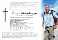 Hast nie geklagt, hast stets geschafft, gar manchmal über deine Kraft. Du warst bescheiden, treu und schlicht. Hast uns umsorgt, geliebt, bewacht und selten nur an dich gedacht. Alles hast du gern gegeben, immer helfen war dein Streben. Du hast ein gutes Herz besessen, nun ruht es still und unvergessen. Plötzlich und für uns alle unfassbar, verstarb mein geliebter Ehemann, unser treusorgender Schwiegersohn, Bruder, Schwager und bester Onkel Franz Attenberger * 15. Juli 1974 + 10. Februar 2026 Harrling, Traitsching, Kirchroth und Niederwinkling Für immer unvergessen in unseren Herzen: Christine Attenberger, Ehefrau Melitta Raab, Schwester Horst Attenberger, Bruder mit Renate Johann und Christine Siedersbeck, Schwiegereltern Daniela Schedlbauer, Schwägerin Hans Siedersbeck, Schwager mit Irmi Simon Siedersbeck, Schwager mit Sabine Christian mit Monika, Martin, Ramona mit Manuel, Alexandra mit Franz, Thomas mit Sophia, Antonia, Lena, Katja, Matilda, Nichten und Neffen im Namen aller Verwandten Der Trauergottesdienst mit anschließender Beerdigung findet am Montag, 16. Februar 2026, um 14.00 Uhr in der Pfarrkirche Harrling statt. Die Aussegnung ist morgen, Samstag, um 16.00 Uhr, anschließend beten wir den Sterberosenkranz. Ein herzliches Vergelt's Gott allen die unseren lieben Franz im Leben gemocht haben und weiterhin liebevoll an ihn denken.