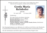 Schlicht und einfach war dein Leben, immer fleißig deine Hand. Ruhe ist dir nun gegeben, schlafe wohl und habe Dank. Gerda Maria Kelnhofer geb. Eck * 28. April 1938 _ 9. Januar 2026 Gleißenberg Wir sagen Dank und nehmen Abschied: Hermann Kelnhofer, Sohn mit Maria Marianne Kussinger, Tochter Reinhard Kelnhofer, Sohn mit Monja Christian, Ramona, Sandra, Christine, Jasmin, Jessica, Enkelkinder Amelie und Valentin, Urenkel im Namen aller Verwandten Der Trauergottesdienst ist am Mittwoch, 21.1.2026 um 14:30 Uhr in der Pfarrkirche St. Bartholomäus Gleißenberg. Die Urnenbeisetzung findet im Familienkreis statt. Für alle Anteilnahme und Gebete sagen wir ein herzliches Vergelt's Gott.
