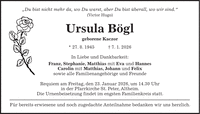 'Du bist nicht mehr da, wo Du warst, aber Du bist überall, wo wir sind.' (Victor Hugo) Ursula Bögl geborene Kaczor * 27. 8. 1945 + 7. 1. 2026 In Liebe und Dankbarkeit: Franz, Stephanie, Matthias mit Eva und Hannes Carolin mit Matthias, Johann und Felix sowie alle Familienangehörige und Freunde Requiem am Freitag, den 23. Januar 2026, um 14.30 Uhr in der Pfarrkirche St. Peter, Altheim. Die Urnenbeisetzung findet im engsten Familienkreis statt. Für bereits erwiesene und noch zugedachte Anteilnahme bedanken wir uns herzlich.