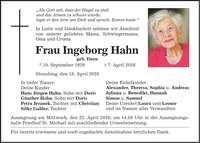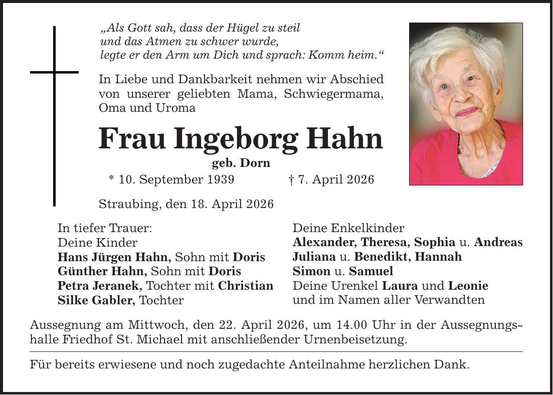 "Als Gott sah, dass der Hügel zu steil und das Atmen zu schwer wurde, legte er den Arm um Dich und sprach: Komm heim." In Liebe und Dankbarkeit nehmen wir Abschied von unserer geliebten Mama, Schwiegermama, Oma und Uroma Frau Ingeborg Hahn geb. Dorn * 10. September 1939 _ 7. April 2026 Straubing, den 18. April 2026 In tiefer Trauer: Deine Kinder Hans Jürgen Hahn, Sohn mit Doris Günther Hahn, Sohn mit Doris Petra Jeranek, Tochter mit Christian Silke Gabler, Tochter Aussegnung am Mittwoch, den 22. April 2026, um 14.00 Uhr in der Aussegnungshalle Friedhof St. Michael mit anschließender Urnenbeisetzung. Für bereits erwiesene und noch zugedachte Anteilnahme herzlichen Dank. Deine Enkelkinder Alexander, Theresa, Sophia u. Andreas Juliana u. Benedikt, Hannah Simon u. Samuel Deine Urenkel Laura und Leonie und im Namen aller Verwandten