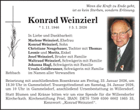 Wenn die Kraft zu Ende geht, ist es kein Sterben, sondern Erlösung. Konrad Weinzierl * 1. 11. 1946 + 5. 1. 2026 In Liebe und Dankbarkeit: Marlene Weinzierl, Ehefrau Konrad Weinzierl, Sohn Christiane Neugebauer, Tochter mit Thomas Leonie und Moritz, Enkel Josef Weinzierl, Bruder mit Familie Waltraud Weinzierl, Schwägerin mit Familie Johanna Hagl, Schwägerin mit Familie Ursula Goldbrunner, Schwägerin mit Familie Rehbach im Namen aller Verwandten Beisetzung mit anschließendem Rosenkranz am Freitag, 23. Januar 2026, um 18.30 Uhr in Gammelsdorf. Trauergottesdienst am Samstag, 24. Januar 2026, um 10 Uhr in Gammelsdorf, anschließend Urnenbestattung in Willersdorf. Statt Blumen und Kränze bitten wir um eine Spende für die Willersdorfer Kirche/kath. Kirchenstiftung Priel, IBAN: DE***, Kennwort: 'Konrad Weinzierl'.