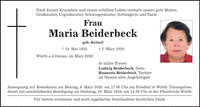 Nach kurzer Krankheit und einem erfüllten Leben verstarb unsere gute Mutter, Großmutter, Urgroßmutter, Schwiegermutter, Schwägerin und Tante Frau Maria Beiderbeck geb. Ketterl * 14. Mai 1935 + 3. März 2026 Wörth a.d.Donau, im März 2026 In stiller Trauer: Ludwig Beiderbeck, Sohn Rosmarie Beiderbeck, Tochter im Namen aller Angehörigen Aussegnung mit Rosenkranz am Montag, 9. März 2026, um 17.00 Uhr am Friedhof in Wörth. Trauergottesdienst mit anschließender Beerdigung am Dienstag, 10. März 2026, um 14.30 Uhr in der Pfarrkirche Wörth. Für bereits erwiesene und noch zugedachte Anteilnahme herzlichen Dank.