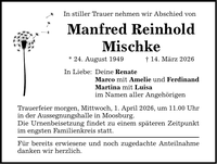 In stiller Trauer nehmen wir Abschied von Manfred Reinhold Mischke * 24. August 1949 _ 14. März 2026 In Liebe: Deine Renate Marco mit Amelie und Ferdinand Martina mit Luisa im Namen aller Angehörigen Trauerfeier morgen, Mittwoch, 1. April 2026, um 11.00 Uhr in der Aussegnungshalle in Moosburg. Die Urnenbeisetzung findet zu einem späteren Zeitpunkt im engsten Familienkreis statt. Für bereits erwiesene und noch zugedachte Anteilnahme danken wir herzlich.