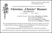 Wenn die Kraft zu Ende geht, ist Erlösung Gnade. In Liebe und Dankbarkeit nehmen wir Abschied von Christine 'Christa' Hauner geb. Schlittmeier * 5. 11. 1940 + 9. 1. 2026 In stiller Trauer: Dein Sohn Christian mit Sylvia Deine Enkelin Susanne Dein Enkel Dennis mit Julia Deine Schwester Helga mit Walter Der Trauergottesdienst findet am Donnerstag, 29. Januar 2026, um 14 Uhr in Mariä Heimsuchung, Altdorf, mit anschließender Urnenbeisetzung im Friedhof Altdorf statt. Von Beileidsbezeigungen am Grab bitten wir Abstand zu nehmen. Für bereits erwiesene und noch zugedachte Anteilnahme 'Herzlichen Dank'.