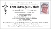'Auferstehung ist unser Glaube, Wiedersehen unsere Hoffnung, Gedenken unsere Liebe.' Frau Herta Julie Jakob geborene Klement * 9. September 1935 + 5. Oktober 2025 Neufraunhofen, den 7. Oktober 2025 In Liebe und Dankbarkeit: Dein Sohn Albin Jakob Dein Bruder Adolf Klement mit Anna Deine Enkelin Christina Venus mit Alexander und Urenkel Maria im Namen aller Verwandten Wortgottesdienst mit anschließender Beerdigung am Freitag, den 10. Oktober 2025, um 15.30 Uhr in der Schlosskirche Neufraunhofen. Ein herzliches Vergelt's Gott für alle Zeichen der Anteilnahme.