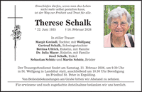 Einschlafen dürfen, wenn man das Leben nicht mehr selbst gestalten kann, ist der Weg zur Freiheit und Trost für alle. Therese Schalk * 22. Juni 1935 _ 16. Februar 2026 In stiller Trauer: Margit Greindl, Tochter, mit Wolfgang Gertrud Schalk, Schwiegertochter Bettina Ullrich, Enkelin, mit Familie Dr. Julia Mayer, Enkelin, mit Familie Josef Schalk, Enkel Sebastian Schütz und Martin Schütz, Brüder Der Trauergottesdienst findet am Samstag, 21. Februar 2026, um 9.30 Uhr in St. Wolfgang in Landshut statt, anschließend um 10.30 Uhr Beerdigung im Friedhof St. Peter in Ergolding. Von Beileidsbekundungen am Grabe bitten wir Abstand zu nehmen. Für erwiesene und noch zugedachte Anteilnahme bedanken wir uns herzlich.