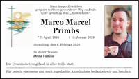 Nach langer Krankheitging ein mühsam gewordener Weg zu Ende.Gott sprach zu ihm: "Komm heim".Marco MarcelPrimbs* 7. April 1998 _ 13. Januar 2026Straubing, den 6. Februar 2026In stiller Trauer: Deine FamilieDie Urnenbeisetzung fand in aller Stille statt.Für bereits erwiesene und noch zugedachte Anteilnahme bedanken wir uns herzlich.