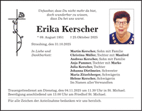 Unfassbar, dass Du nicht mehr da bist, doch wunderbar zu wissen, dass Du bei uns warst. Erika Kerscher * 09. August 1951 + 25.Oktober 2025 Straubing, den 31.10.2025 In Liebe und Martin Kerscher, Sohn mit Familie Dankbarkeit: Christina Müller, Tochter mit Manfred Andreas Kerscher, Sohn mit Familie Anja Pammer, Tochter mit Marko Julia Kerscher, Tochter Johanna Dietlmeier, Schwester Maria Zitzelsberger, Schwägerin Helene Kerscher, Schwägerin Im Namen aller Verwandten Trauergottesdienst am Dienstag, den 04.11. 2025 um 11.30 Uhr in St. Michael. Beerdigung anschließend um 13.00 Uhr am Friedhof St. Michael. Für alle Zeichen der Anteilnahme bedanken wir uns herzlich. Unfassbar, dass Du nicht mehr da bist, doch wunderbar zu wissen, dass Du bei uns warst. Erika Kerscher * 09. August 1951 + 25.Oktober 2025 Straubing, den 01.11.2025 In Liebe und Dankbarkeit: Martin Kerscher, Sohn mit Familie Christina Müller, Tochter mit Manfred Andreas Kerscher, Sohn mit Familie Anja Pommer, Tochter mit Marko Julia Kerscher, Tochter Johanna Dietlmeier, Schwester Maria Ziztelsberger, Schwägerin Helene Kerscher, Schwägerin Im Namen aller Verwandten Trauergottesdienst am Dienstag ,den 04.11.2025 um 11.30 Uhr in St. Michael. Beerdigung anschließend um 13.00 Uhr am Friedhof St. Michael. Für alle Zeichen der Anteilnahme bedanken wir und herzlich.