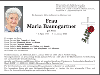 Weinet nicht, ich hab's überwunden, ich bin erlöst von Schmerz und Pein. Denkt gern zurück an mich in schönen Stunden, lasst mich in Gedanken bei Euch sein. In dankbarer Liebe nehmen wir Abschied von Frau Maria Baumgartner geb. Wirler * 5. April 1940 + 15. Januar 2026 Es trauern um Dich: Deine Tochter Rita Ürmösi mit Sepp Deine Tochter Hildegard Aigner mit Franz Deine Tochter Christine Brunner Deine Enkelin Julia Stömmer mit Nadine und Sophie Deine Enkelin Steffi Reimann mit Tom, Magdalena und Johanna im Namen aller Verwandten Sterberosenkranz am Mittwoch, den 21. Januar 2026, um 18.00 Uhr in Niederhöcking. Trauergottesdienst am Donnerstag, den 22. Januar 2026, um 14.30 Uhr in der Pfarrkirche in Niederhöcking mit anschließender Urnenbestattung. Anstelle von Blumen- und Kränzen bitten wir um eine Spende an: Förderverein Seniorenheim Landau e.V. IBAN: DE***, Kennwort 'Maria Baumgartner'. Für bereits erwiesene und noch zugedachte Anteilnahme bedanken wir uns herzlich. Ein besonderer Dank gilt dem Heiliggeist-Bürgerspital in Landau für ihre würdevolle Pflege und Herrn Dr. Ambos für die langjährige medizinische Betreuung.