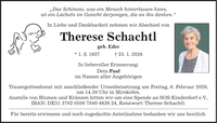 'Das Schönste, was ein Mensch hinterlassen kann, ist ein Lächeln im Gesicht derjenigen, die an ihn denken.' In Liebe und Dankbarkeit nehmen wir Abschied von Therese Schachtl geb. Eder * 1. 8. 1937 + 25. 1. 2026 In liebevoller Erinnerung: Dein Paul im Namen aller Angehörigen Trauergottesdienst mit anschließender Urnenbeisetzung am Freitag, 6. Februar 2026, um 14.30 Uhr in Mirskofen. Anstelle von Blumen und Kränzen bitten wir um eine Spende an SOS Kinderdorf e.V., IBAN: DE***, Kennwort: Therese Schachtl. Für bereits erwiesene und noch zugedachte Anteilnahme bedanken wir uns herzlich.