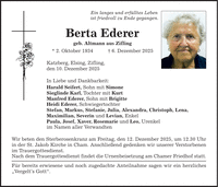 Ein langes und erfülltes Lebenist friedvoll zu Ende gegangen.Berta Ederer geb. Altmann aus Zifling* 2. Oktober 1934 _ 6. Dezember 2025Katzberg, Elsing, Zifling,den 10. Dezember 2025In Liebe und Dankbarkeit:Harald Seifert, Sohn mit SimoneSieglinde Karl, Tochter mit KurtManfred Ederer, Sohn mit BrigitteHeidi Ederer, SchwiegertochterStefan, Markus, Stefanie, Julia, Alexandra, Christoph, Lena,Maximilian, Severin und Levian, EnkelPaula, Josef, Xaver, Rosemarie und Leo, Urenkelim Namen aller Verwandten Wir beten den Sterberosenkranz am Freitag, den 12. Dezember 2025, um 12.30 Uhr in der St. Jakob Kirche in Cham. Anschließend gedenken wir unserer Verstorbenen im Trauergottesdienst.Nach dem Trauergottesdienst findet die Urnenbeisetzung am Chamer Friedhof statt.Für bereits erwiesene und noch zugedachte Anteilnahme sagen wir ein herzliches