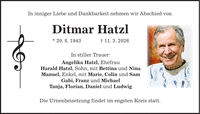 In inniger Liebe und Dankbarkeit nehmen wir Abschied von Ditmar Hatzl * 20. 8. 1943 + 11. 3. 2026 In stiller Trauer: Angelika Hatzl, Ehefrau Harald Hatzl, Sohn, mit Bettina und Nina Manuel, Enkel, mit Marie, Colin und Sam Gabi, Franz und Michael Tanja, Florian, Daniel und Ludwig Die Urnenbeisetzung findet im engsten Kreis statt.
