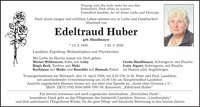 Traurig, weil Du nicht mehr bei uns bist. Erleichtert, Dich erlöst zu wissen. Unendlich dankbar, für all Deine Liebe und Fürsorge. Nach ihrem langen und erfüllten Leben nehmen wir in Liebe und Dankbarkeit Abschied von Edeltraud Huber geb. Händlmayer * 12. 2. 1930 + 28. 3. 2026 Landshut, Ergolding, Weihenstephan und Pfarrkirchen Mit Liebe im Herzen lassen wir Dich gehen: Werner Wildwasser, Sohn, mit Gaby Gerda Händlmayer, Schwägerin, mit Familie Birgit Beck, Tochter, mit Waki Lotte Aigner, Schwägerin, mit Familie Korbinian mit Maike und Benedikt mit Hannah, Enkel im Namen aller Angehörigen Trauergottesdienst am Mittwoch, den 15. April 2026, um 8.30 Uhr in St. Peter und Paul, Landshut, mit anschließender Urnenbeisetzung um 10.00 Uhr am Hauptfriedhof Landshut. Anstelle zugedachter Blumen freuen wir uns über eine Spende an 'Ärzte ohne Grenzen e.V.', IBAN: DE***, Kennwort: 'Edeltraud Huber'. Für bereits erwiesene und noch zugedachte Anteilnahme 'Herzlichen Dank', besonderer Dank geht an das Pflegeteam des Jodokstift Landshut, Station 'Ländtorplatz' und dem ambulanten Pflegedienst Witzke für die gute Pflege und häusliche Betreuung in den letzten Jahren.