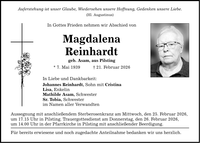 Auferstehung ist unser Glaube, Wiedersehen unsere Hoffnung, Gedenken unsere Liebe. (Hl. Augustinus) In Gottes Frieden nehmen wir Abschied von Magdalena Reinhardt geb. Asam, aus Pilsting * 7. Mai 1939 _ 21. Februar 2026 In Liebe und Dankbarkeit: Johannes Reinhardt, Sohn mit Cristina Lisa, Enkelin Mathilde Asam, Schwester Sr. Tobia, Schwester im Namen aller Verwandten Aussegnung mit anschließendem Sterberosenkranz am Mittwoch, den 25. Februar 2026, um 17.15 Uhr in Pilsting. Trauergottesdienst am Donnerstag, den 26. Februar 2026, um 14.00 Uhr in der Pfarrkirche in Pilsting mit anschließender Beerdigung. Für bereits erwiesene und noch zugedachte Anteilnahme bedanken wir uns herzlich.