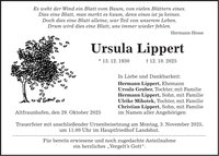 Es weht der Wind ein Blatt vom Baum, von vielen Blättern eines. Dies eine Blatt, man merkt es kaum, denn eines ist ja keines. Doch dies eine Blatt alleine, war Teil von unserem Leben. Drum wird dies eine Blatt, uns immer wieder fehlen. Hermann Hesse Ursula Lippert * 13. 12. 1930 + 12. 10. 2025 In Liebe und Dankbarkeit: Hermann Lippert, Ehemann Ursula Gruber, Tochter, mit Familie Hermann Lippert, Sohn, mit Familie Ulrike Mihotek, Tochter, mit Familie Christian Lippert, Sohn, mit Familie Altfraunhofen, den 29. Oktober 2025 im Namen aller Angehörigen Trauerfeier mit anschließender Urnenbeisetzung am Montag, 3. November 2025, um 11.00 Uhr im Hauptfriedhof Landshut. Für bereits erwiesene und noch zugedachte Anteilnahme ein herzliches 'Vergelt's Gott'.