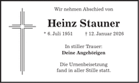 Wir nehmen Abschied von Heinz Stauner * 6. Juli 1951 + 12. Januar 2026 In stiller Trauer: Deine Angehörigen Die Urnenbeisetzung fand in aller Stille statt.