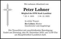 Wir nehmen Abschied von Peter Lohner Mitglied der FFW Stadt Landshut * 22. 5. 1955 _ 19. 12. 2025 In stiller Trauer: Ilse Lohner, Mutter Geschwister und Angehörige Die Trauerfeier mit anschließender Beerdigung findet am Dienstag, den 30. Dezember 2025, um 12.00 Uhr am Hauptfriedhof Landshut statt.