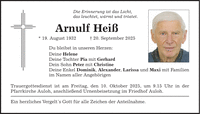 Die Erinnerung ist das Licht, das leuchtet, wärmt und tröstet. Arnulf Heiß * 19. August 1932 _ 20. September 2025 Du bleibst in unseren Herzen: Deine Helene Deine Tochter Pia mit Gerhard Dein Sohn Peter mit Christine Deine Enkel Dominik, Alexander, Larissa und Maxi mit Familien im Namen aller Angehörigen Trauergottesdienst ist am Freitag, den 10. Oktober 2025, um 9.15 Uhr in der Pfarrkirche Auloh, anschließend Urnenbeisetzung im Friedhof Auloh. Ein herzliches Vergelt's Gott für alle Zeichen der Anteilnahme.