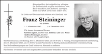 Ein gutes Herz hat aufgehört zu schlagen. Du wolltest doch so gern noch bei uns sein. Es ist so schwer, den Schmerz zu tragen, denn ohne Dich wird vieles anders sein. In Liebe und Dankbarkeit nehmen wir Abschied von Franz Steininger aus Goben * 7. November 1942 + 6. Dezember 2025 Für immer in unseren Herzen: Kerstin Aigner, Tochter mit Andreas, Luis und Jonas Andrea Steininger, Tochter im Namen aller Angehörigen Sterberosenkranz, am Montag, den 15. Dezember 2025, um 18.00 Uhr in Pilsting. Trauergottesdienst am Dienstag, den 16. Dezember 2025, um 14.00 Uhr in der Pfarrkirche in Pilsting mit anschließender Urnenbestattung. Von Beileidsbezeigungen am Grab bitten wir Abstand zu nehmen. Für bereits erwiesene und noch zugedachte Anteilnahme bedanken wir uns herzlich.