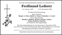 In Liebe und Dankbarkeit nehmen wir Abschied von Ferdinand Lederer * 14. Januar 1932 _ 26. November 2025 In liebevoller Erinnerung: Deine Töchter: Margit mit Peter, Bärbl mit Fonsi, Friederike mit Gustl Deine Enkelkinder: Matthias, Michael, Thomas, Florian, Andrea, Stefan, Kathrin, Christian mit Familien und Angehörigen Der Trauergottesdienst ist am Dienstag, 9. Dezember 2025, um 10.00 Uhr in der Pfarrkirche Hl. Blut, anschließend um 11.00 Uhr Beerdigung im Friedhof Achdorf, Landshut. Herzlichen Dank für alle Zeichen der Anteilnahme.