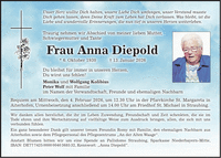 Unser Herz wollte Dich halten, unsere Liebe Dich umfangen, unser Verstand musste Dich gehen lassen, denn Deine Kraft zum Leben hat Dich verlassen. Was bleibt, ist die Liebe und wundervolle Erinnerungen, die nun tief in unseren Herzen weiterleben. Traurig nehmen wir Abschied von meiner lieben Mutter, Schwiegermutter und Tante Frau Anna Diepold * 6. Oktober 1930 + 13. Januar 2026 Du bleibst für immer in unseren Herzen, Du wirst uns fehlen! Monika und Wolfgang Kolibius Peter Wolf mit Familie im Namen der Verwandtschaft, Freunde und ehemaligen Nachbarn Requiem am Mittwoch, den 4. Februar 2026, um 12.30 Uhr in der Pfarrkirche St. Margareta in Aiterhofen, Urnenbeisetzung anschließend um 14.00 Uhr am Friedhof St. Michael in Straubing. Wir danken allen herzlichst, die ihr im Leben Zuwendung, Freundschaft und Zeit schenkten, die sie im Tode ehren und ihre Wertschätzung auf vielfältige Weise zum Ausdruck bringen, allen, die sich mit uns verbunden fühlen. Ein ganz besonderer Dank gilt unserer treuen Freundin Romy mit Familie, den ehemaligen Nachbarn aus Aiterhofen sowie dem Pflegepersonal des Pflegezentrums 'An der Alten Waage'. Anstatt Blumen bitten wir um eine Spende an Pallidomo Straubing, Sparkasse Niederbayern-Mitte, IBAN: DE***, Kennwort: 'Anna Diepold'.