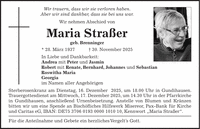 Wir trauern, dass wir sie verloren haben. Aber wir sind dankbar, dass sie bei uns war. Wir nehmen Abschied von Maria Straßer geb. Brenninger * 28. März 1937 + 30. November 2025 In Liebe und Dankbarkeit: Andrea mit Peter und Jasmin Robert mit Renate, Bernhard, Johannes und Sebastian Roswitha Maria Georgia im Namen aller Angehörigen Sterberosenkranz am Dienstag, 16. Dezember 2025, um 18.00 Uhr in Gundihausen. Trauergottesdienst am Mittwoch, 17. Dezember 2025, um 14.30 Uhr in der Pfarrkirche in Gundihausen, anschließend Urnenbeisetzung. Anstelle von Blumen und Kränzen bitten wir um eine Spende an Bischöfliches Hilfswerk Misereor, Pax-Bank für Kirche und Caritas eG, IBAN: DE***, Kennwort 'Maria Straßer'. Für die Anteilnahme und Gebete ein herzliches Vergelt's Gott.