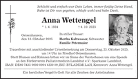 Schlicht und einfach war Dein Leben, immer fleißig Deine Hand, Ruhe ist Dir nun gegeben, schlafe wohl und habe Dank. Anna Wettengel * 1. 4. 1934 + 4. 10. 2025 Geisenhausen, In stiller Trauer: den 18. Oktober 2025 Hertha Kaltwasser, Schwester Familie Petermaier Trauerfeier mit anschließender Urnenbeisetzung am Donnerstag, 23. Oktober 2025, um 14 Uhr im Friedhof Geisenhausen. Statt Blumen und Kränzen bitten wir im Sinne der Verstorbenen um eine Spende an den Förderverein Palliativmedizin Landshut e.V.: Sparkasse Landshut, IBAN: DE***, BIC: BYLADEM1LAH, Kennwort: Anna Wettengel. Ein herzliches Vergelt's Gott für alle Zeichen der Anteilnahme.