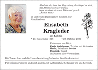 Als Gott sah, dass der Weg zu lang, der Hügel zu steil, das Atmen zu schwer wurde, legte er seinen Arm um Dich und sprach: "Komm heim." In Liebe und Dankbarkeit nehmen wir Abschied von Elisabeth Kragleder aus Landau * 20. September 1936 _ 22. Oktober 2025 Die Trauerfeier und die Urnenbestattung finden im Familienkreis statt. Für bereits erwiesene und noch zugedachte Anteilnahme bedanken wir uns herzlich. Es trauern um Dich: Karin Steinberger, Tochter mit Sylvester Mario, Enkel mit Bettina Dominik, Enkel im Namen aller Verwandten