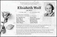 Der Tod ist das Tor zum Licht am Ende eines mühsam gewordenen Weges. Elisabeth Wolf geb. Mayer * 16. Mai 1929 + 27. November 2025 In liebevollem Gedenken: Deine Nichten und Neffen mit Familien Dr. Angelika Loo Simone Riss Silvia Mayer Annemarie Stauber Walter Mayer Karin Draack Bernhard Sturtz Pius Kieninger Albert Mayer Andrea Wagner Rosenkranz am 04.12.2025 um 17:30 Uhr und Trauergottesdienst am 05.12.2025 um 11:45 Uhr in der Pfarrkirche St. Michael. Die Beerdigung findet um 13 Uhr am Friedhof St. Michael statt. Ein besonderer Dank gilt dem Pflegepersonal im 3. Stock des Marienstifts für die gute und liebevolle Betreuung unserer Tante und auch Frau Fischmann für die ärztliche Begleitung. Ein herzliches Vergelt's Gott für alle Zeichen der Anteilnahme.