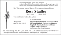 Einschlafen dürfen, wenn man müde ist und eine Last fallen lassen dürfen, die man lange getragen hat, das ist eine tröstliche, eine wunderbare Sache. (Hermann Hesse) Der Tod erlöste unsere Mutter, Schwiegermutter und Oma Rosa Stadler * 22. 1. 1932 + 20. 4. 2015 von den Beschwerden des Alters. In stiller Trauer: Harpolden, Irmgard Stinglhammer, Tochter, mit Max den 22. April 2015 Edeltraud Jänsch, Tochter, mit Herbert Sieglinde Jänsch, Enkelin, mit Sepp Claudia Jänsch, Enkelin im Namen aller Angehörigen Am Donnerstag, den 23. April 2015, um 14.00 Uhr Rosenkranz, um 14.30 Uhr Trauergottesdienst mit anschließender Beerdigung in Harpolden.