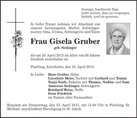 Sonnige, leuchtende Tage, nicht weinen, dass sie vergangen, lächeln, weil sie gewesen. In tiefer Trauer nehmen wir Abschied von unserer herzensguten Mutter, Schwiegermutter, Oma, Uroma, Schwägerin und Tante Frau Gisela Gruber geb. Sickinger die am 20. April 2015 im Alter von 88 Jahren friedlich entschlafen ist. Plattling, Aiterhofen, den 22. April 2015 In Liebe: Hans Gruber, Sohn Lieselotte Meier, Tochter mit Gerhard und Timmi Tanja Senft, Enkelin mit Thomas, Nadine und Sam Annerose Sickinger, Schwägerin Reinhard Weise, Neffe Irene Friedrich im Namen aller Verwandten Requiem am Donnerstag, den 23. April 2015, um 13.00 Uhr in Plattling, ­St. Michael, anschließend Beerdigung in St. Jakob.