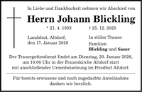 In Liebe und Dankbarkeit nehmen wir Abschied von Herrn Johann Blickling * 21. 4. 1933 _ 25. 12. 2025 Landshut, Altdorf, den 17. Januar 2026 Der Trauergottesdienst findet am Dienstag, 20. Januar 2026, um 10.00 Uhr in der Frauenkirche Altdorf statt mit anschließender Urnenbeisetzung im Friedhof Altdorf. Für bereits erwiesene und noch zugedachte Anteilnahme danken wir herzlich. In stiller Trauer: Familien Blickling und Sauer
