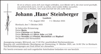 Es ist so schwer, wenn sich zwei Augen schließen, zwei Hände ruh'n, die einst soviel geschafft, wie schmerzlich war's, vor dir zu stehen, dem Leiden hilflos zuzusehen. Schlaf' nun in Frieden, ruhe sanft und hab' für alle Liebe Dank. Johann ,Hans' Steinberger Landwirt * 21. August 1952 + 1. Oktober 2025 Birnbach, den 7. Oktober 2025 In liebevoller Erinnerung: Deine Maria Deine Christine mit Stefan Deine Michaela mit Oliver, John und Lili Deine Veronika mit Florian, Maximilian und Raphael im Namen aller Verwandten Aussegnung morgen, Mittwoch, um 17.30 Uhr; anschließend Sterberosenkranz. Requiem mit anschließender Beerdigung am Donnerstag, 9. Oktober 2025, um 14.00 Uhr in Birnbach. Von Beileidsbezeigungen am Grab bitten wir abzusehen. Für bereits erwiesene und noch zugedachte Anteilnahme bedanken wir uns herzlich.Es ist so schwer, wenn sich zwei Augen schließen, zwei Hände ruh'n, die einst soviel geschafft, wie schmerzlich war's, vor dir zu stehen, dem Leiden hilflos zuzusehen. Schlaf' nun in Frieden, ruhe sanft und hab' für alle Liebe Dank. Johann ,Hans' Steinberger Landwirt * 21. August 1952 + 1. Oktober 2025 Birnbach, den 7. Oktober 2025 In liebevoller Erinnerung: Deine Maria Deine Christine mit Stefan Deine Michaela mit Oliver, John und Lili Deine Veronika mit Florian, Maximilian und Raphael im Namen aller Verwandten Aussegnung morgen, Mittwoch, um 17.30 Uhr; anschließend Sterberosenkranz. Requiem mit anschließender Beerdigung am Donnerstag, 9. Oktober 2025, um 14.00 Uhr in Birnbach. Von Beileidsbezeigungen am Grab bitten wir abzusehen. Für bereits erwiesene und noch zugedachte Anteilnahme bedanken wir uns herzlich.