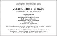 Nichts ist mehr ohne Dich, so wie es war, doch Du bleibst weiter in unseren Herzen. Anton 'Toni' Braun * 10. Oktober 1939 + 8. Februar 2026 Sigrid Scholz-Pohl Viola Braun Beate Benthien mit Kay und Sara Rudi Braun mit Familie Simone Pohl-Winkler mit Thomas Vanessa Vu Van im Namen aller Angehörigen Die Urnenbeisetzung findet am Freitag, den 20. März 2026, um 12.00 Uhr im Nordfriedhof Landshut statt. Anstelle von Blumen und Kränzen bitten wir um eine Spende an die Lebenshilfe Landshut, IBAN: DE***, Kennwort: 'Spende statt Blumen - Anton Braun'.