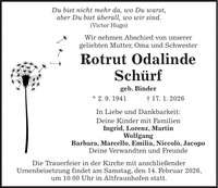 Du bist nicht mehr da, wo Du warst, aber Du bist überall, wo wir sind. (Victor Hugo) Wir nehmen Abschied von unserer geliebten Mutter, Oma und Schwester Rotrut Odalinde Schürf geb. Binder * 2. 9. 1941 + 17. 1. 2026 In Liebe und Dankbarkeit: Deine Kinder mit Familien Ingrid, Lorenz, Martin Wolfgang Barbara, Marcello, Emilia, Niccolò, Jacopo Deine Verwandten und Freunde Die Trauerfeier in der Kirche mit anschließender Urnenbeisetzung findet am Samstag, den 14. Februar 2026, um 10.00 Uhr in Altfraunhofen statt.