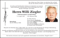 Nur Arbeit war Dein Leben, nie dachtest Du an Dich. Nur für die Deinen streben, war Deine höchste Pflicht. In Liebe und Dankbarkeit nehmen wir Abschied von meinem lieben Ehemann, unserem guten Vater, Schwiegervater, Opa, Bruder, Schwager und Onkel Herrn Willi Ziegler Fuhrunternehmer aus Rottenburg * 15. April 1937 + 22. Februar 2026 In stiller Trauer: Deine Ehefrau Katharina Rottenburg, Dein Sohn Alfred mit Familie den 28. Februar 2026 Dein Sohn Lothar Dein Bruder Lothar mit Familie im Namen aller Verwandten Requiem am Samstag, den 7. März 2026, um 11.00 Uhr in der Pfarrkirche St. Georg in Rottenburg, anschließend Urnenbeisetzung auf dem Ostfriedhof. Anstelle von Kränzen und Blumen bitten wir um eine Spende an die Ambulante Krankenpflege Rottenburg, IBAN: DE***, Empfänger: Ambulanter Kranken- und Altenpflegeverein, Kennwort: 'Willi Ziegler'. Für bereits erwiesene und noch zugedachte Anteilnahme ein herzliches 'Vergelt's Gott!'.