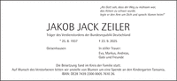 'Als Gott sah, dass der Weg zu mühsam war, das Atmen zu schwer wurde, legte er den Arm um Dich und sprach: Komm heim!' JAKOB JACK ZEILER Träger des Verdienstordens der Bundesrepublik Deutschland * 25. 8. 1937 + 23. 9. 2025 Geisenhausen In stiller Trauer: Eva, Markus, Andreas, Gabi und Freunde Die Beisetzung fand im Kreis der Familie statt. Auf Wunsch des Verstorbenen bitten wir anstelle von Blumen um eine Spende an den Kindergarten Tansania, IBAN: DE***.