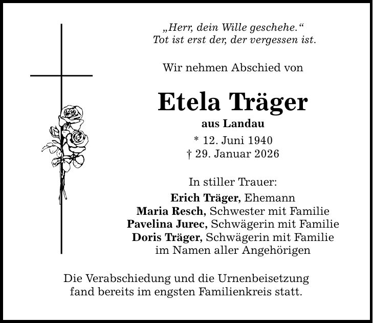 "Herr, dein Wille geschehe." Tot ist erst der, der vergessen ist.Wir nehmen Abschied vonEtela Trägeraus Landau* 12. Juni 1940_ 29. Januar 2026In stiller Trauer:Erich Träger, EhemannMaria Resch, Schwester mit FamiliePavelina Jurec, Schwägerin mit FamilieDoris Träger, Schwägerin mit Familieim Namen aller AngehörigenDie Verabschiedung und die Urnenbeisetzungfand bereits im engsten Familienkreis statt.