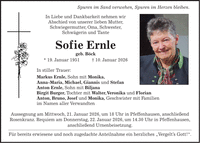 Spuren im Sand verwehen, Spuren im Herzen bleiben. In Liebe und Dankbarkeit nehmen wir Abschied von unserer lieben Mutter, Schwiegermutter, Oma, Schwester, Schwägerin und Tante Sofie Ernle geb. Böck * 19. Januar 1951 + 10. Januar 2026 In stiller Trauer: Markus Ernle, Sohn mit Monika, Anna-Maria, Michael, Giannis und Stefan Anton Ernle, Sohn mit Biljana Birgit Burger, Tochter mit Walter, Veronika und Florian Anton, Bruno, Josef und Monika, Geschwister mit Familien im Namen aller Verwandten Aussegnung am Mittwoch, 21. Januar 2026, um 18 Uhr in Pfeffenhausen, anschließend Rosenkranz. Requiem am Donnerstag, 22. Januar 2026, um 14.30 Uhr in Pfeffenhausen, anschließend Urnenbeisetzung. Für bereits erwiesene und noch zugedachte Anteilnahme ein herzliches 'Vergelt's Gott!'.
