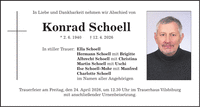 In Liebe und Dankbarkeit nehmen wir Abschied von Konrad Schoell * 2. 6. 1940 + 12. 4. 2026 In stiller Trauer: Ella Schoell Hermann Schoell mit Brigitte Albrecht Schoell mit Christina Martin Schoell mit Uschi Ilse Schoell-Mohr mit Manfred Charlotte Schoell im Namen aller Angehörigen Trauerfeier am Freitag, den 24. April 2026, um 12.30 Uhr im Trauerhaus Vilsbiburg mit anschließender Urnenbeisetzung.