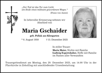 "Der Tod ist das Tor zum Licht am Ende eines mühsam gewordenen Weges." (Franz von Assisi) In liebevoller Erinnerung nehmen wir Abschied von Maria Gschaider geb. Pollak aus Kleegarten * 6. August 1950 _ 15. Dezember 2025 Trauergottesdienst am Montag, den 29. Dezember 2025, um 14.00 Uhr in der Pfarrkirche in Zeholfing mit anschließender Urnenbestattung. In stiller Trauer: Maria Maier, Nichte mit Familie Ludwig Espertshuber, Neffe mit Familie im Namen aller Verwandten